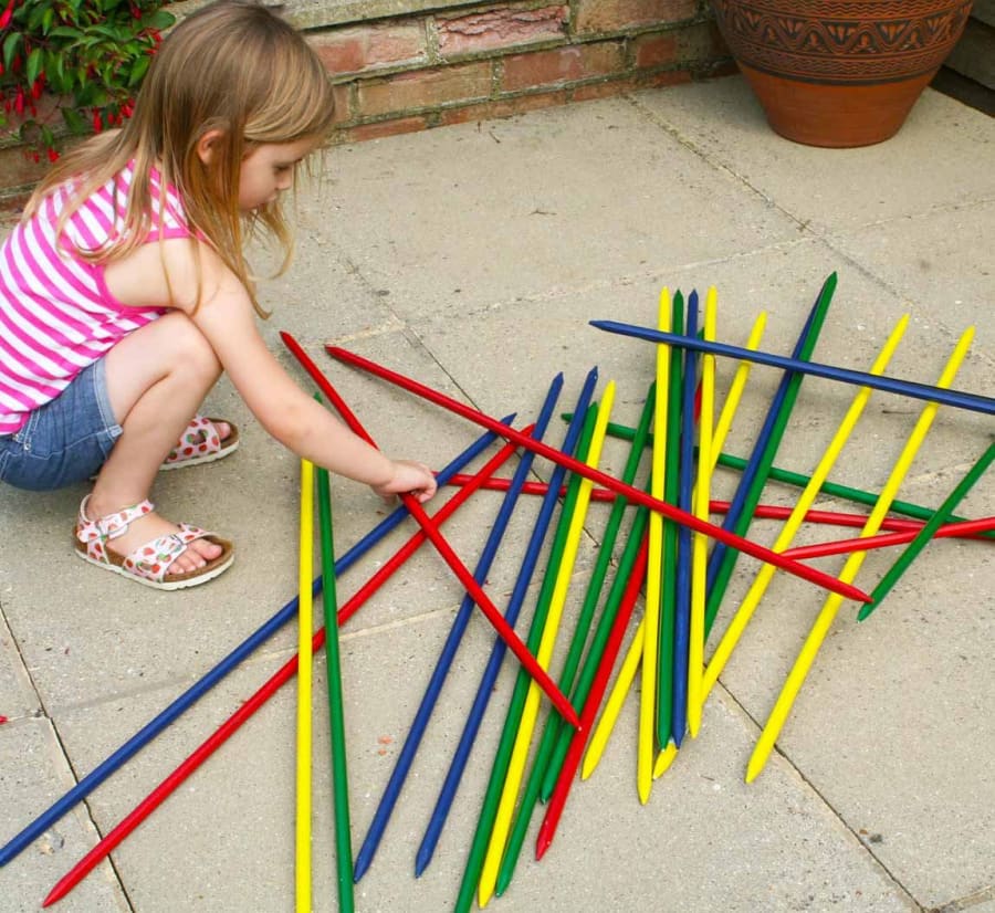 The aim of the game is very simple, stand the sticks up all together in a brunch, drop them to the fall, leave them however they fall, the more tangled the better! Now each play in turn has to try to remove a stick with out disturbing the remaining sticks. Tricky, tricky, tricky!!