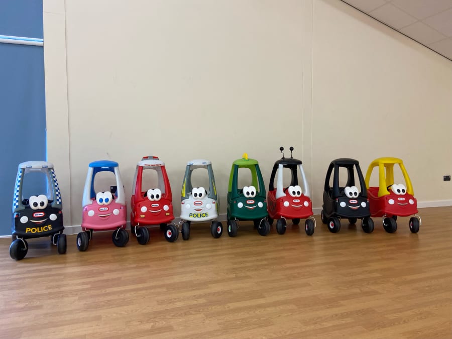This package hire includes 8 Little Tikes cars they always come with the insert bases for those younger children, but you're welcome to take these out if you have children who are walking to push themselves along the floor.